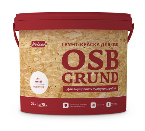 Грунт-краска Holzer OSB Grund предназначен для предварительной обработки ориентированно-стружечных плит перед нанесением декоративных штукатурок и других покрытий, а также защиты от негативного воздействия влаги, атмосферных осадков, УФ-излучения в период эксплуатации OSB без покрытия. Может наноситься на пенополистирольные плиты и ДСП.